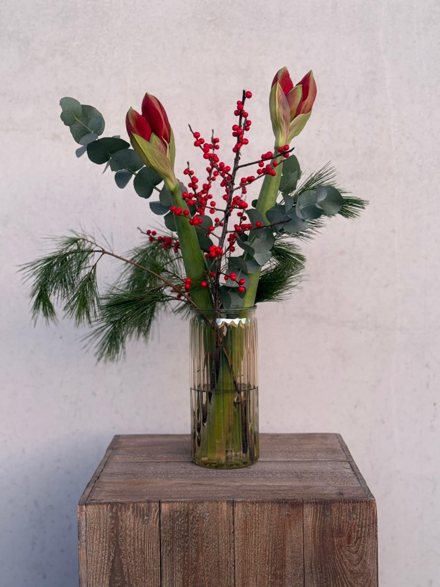Stijlvolle kerstvaas met rode amaryllis, ilexbes, eucalyptus en kerstgroen. Tijdloos, luxe en perfect voor de feestdagen.