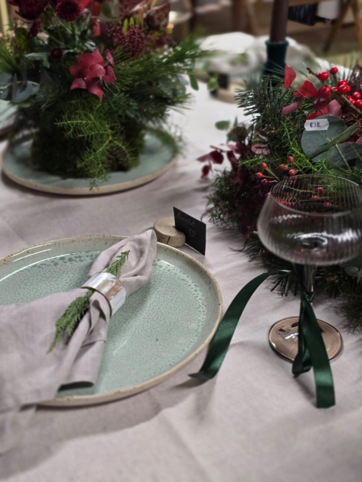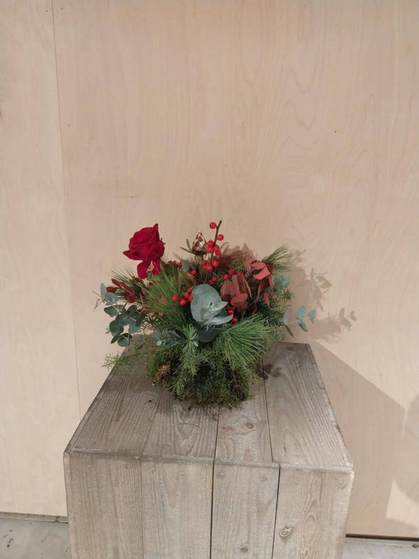 Kerstbloemstukje op mos, een vrolijke touch voor de kersttafel.