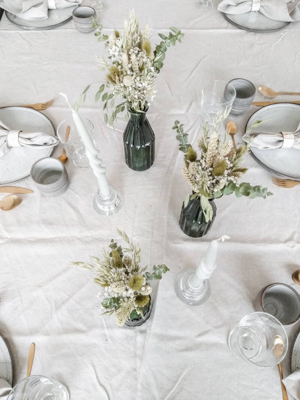 Dondergroen vaasje met droogbloemen in verschillende tinten van groen.