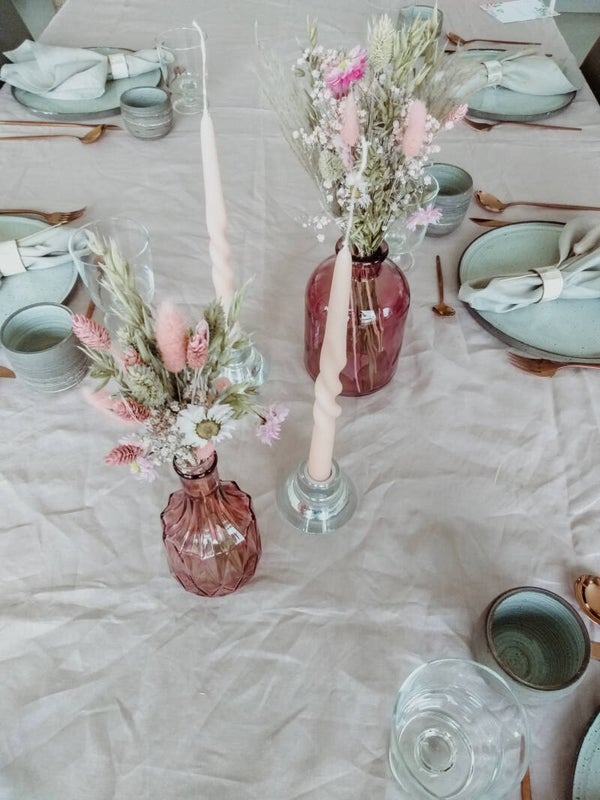 Oudroze vaasje met bloemen in neutrale en roze kleuren.